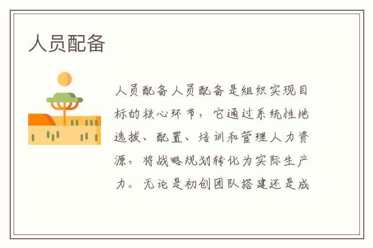 人员配备是组织实现目标的核心环节,它通过系统性地选拔、配置、培训和管理人力资源,将战略规划转化为实际生产力。无论是初创团队搭建还是成熟企业优化,其本质都是解决“让合适的人在合适的位置上做合适的事”这一根本问题。有效的人员配备不仅能激活组织活力——据统计,科学配置的团队比随机组合团队效率高出40%——更能为长期发展储备关键人才。