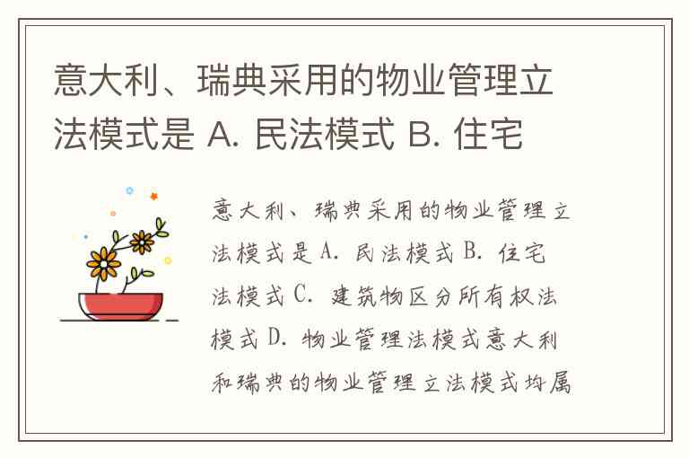 意大利、瑞典采用的物业管理立法模式是 A. 民法模式 B. 住宅法模式 C. 建筑物区分所有权法模式 D. 物业管理法模式