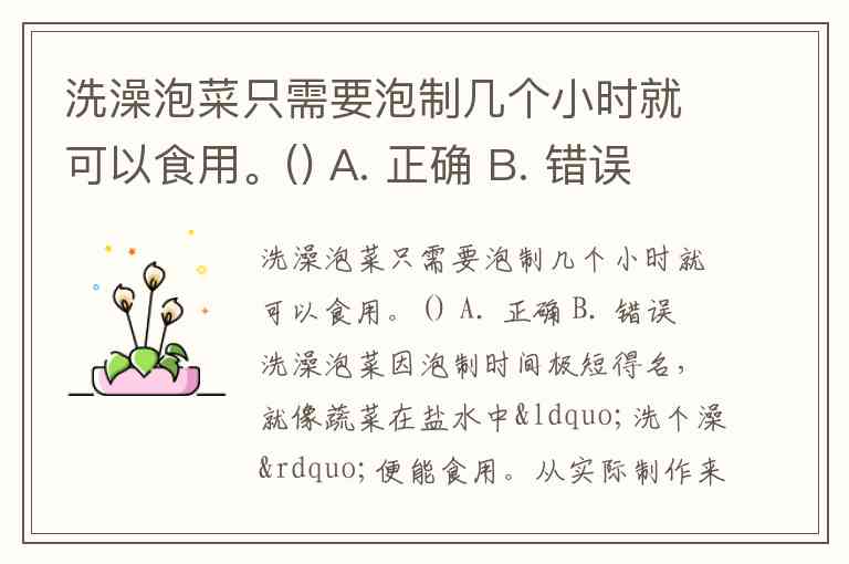 洗澡泡菜只需要泡制几个小时就可以食用。() A. 正确 B. 错误