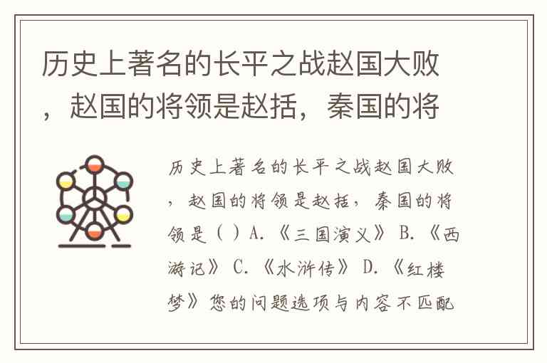历史上著名的长平之战赵国大败,赵国的将领是赵括,秦国的将领是()A.《三国演义》 B.《西游记》 C.《水浒传》 D.《红楼梦》