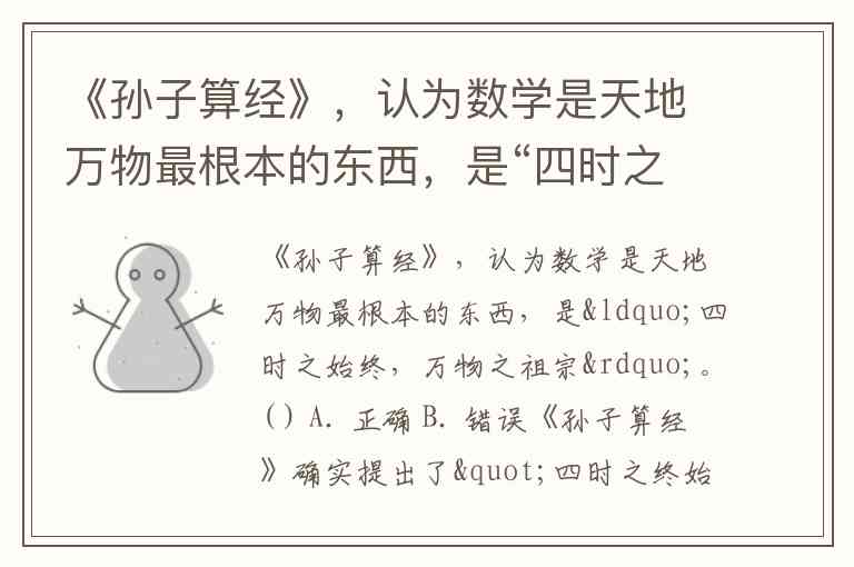 《孙子算经》,认为数学是天地万物最根本的东西,是“四时之始终,万物之祖宗”。( ) A. 正确 B. 错误