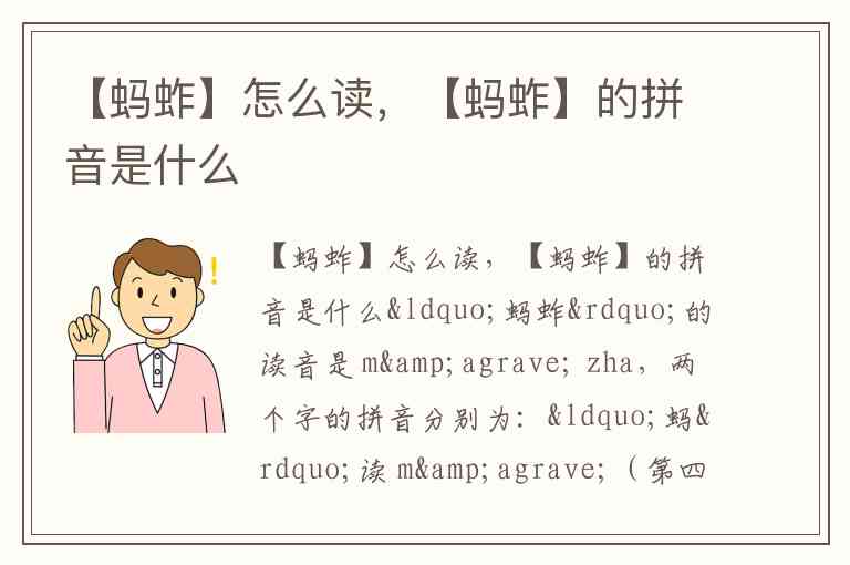 “蚂蚱”的读音是 mà zha,两个字的拼音分别为:“蚂”读 mà(第四声),“蚱”读 zha(轻声,不加声调符号)。