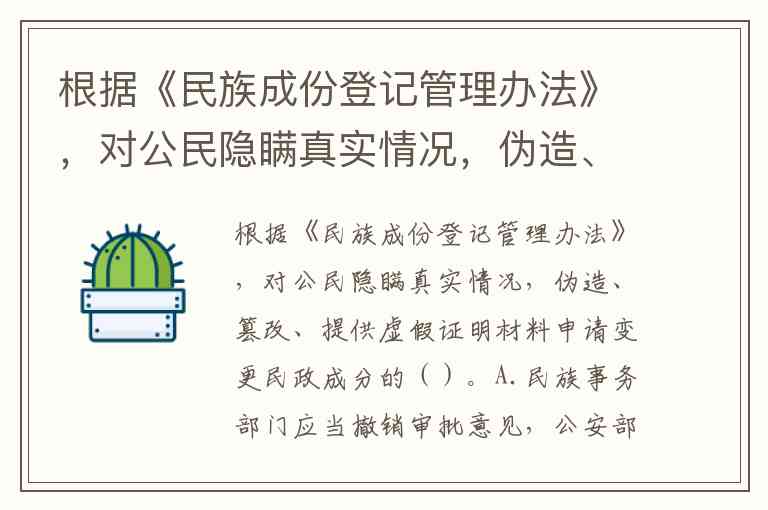 根据《民族成份登记管理办法》,对公民隐瞒真实情况,伪造、篡改、提供虚假证明材料申请变更民政成分的()。A.民族事务部门应当撤销审批意见,公安部门应当撤销变更登记,同时通报相关部门收回 B.该公民依据虚假民族成份享受的相关权益 C.构成违反治安管理行为的,依法予以治安管理处罚 D.构成犯罪的,依法追究刑事责任