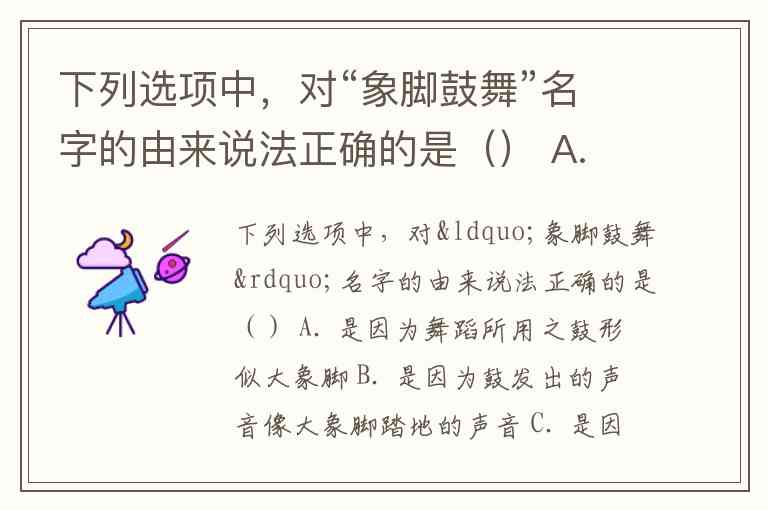 下列选项中,对“象脚鼓舞”名字的由来说法正确的是() A. 是因为舞蹈所用之鼓形似大象脚 B. 是因为鼓发出的声音像大象脚踏地的声音 C. 是因为鼓是由大象脚制成