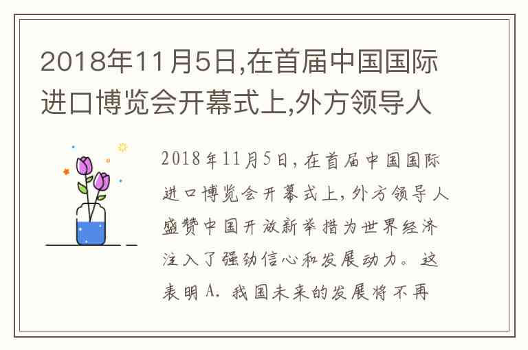 2018年11月5日,在首届中国国际进口博览会开幕式上,外方领导人盛赞中国开放新举措为世界经济注入了强劲信心和发展动力。这表明 A. 我国未来的发展将不再面临挑战 B. 我国致力于促进世界和平与发展 C. 我国在未来必将主导世界的发展 D. 对外开放己成为我国的中心工作