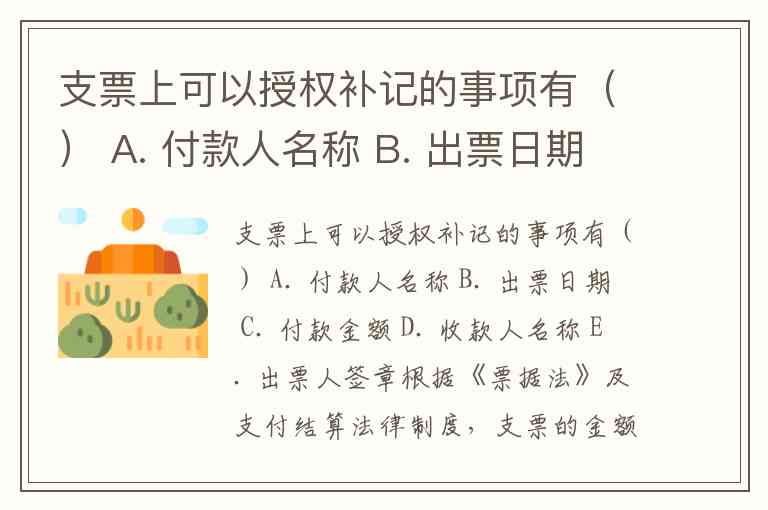 支票上可以授权补记的事项有() A. 付款人名称 B. 出票日期 C. 付款金额 D. 收款人名称 E. 出票人签章