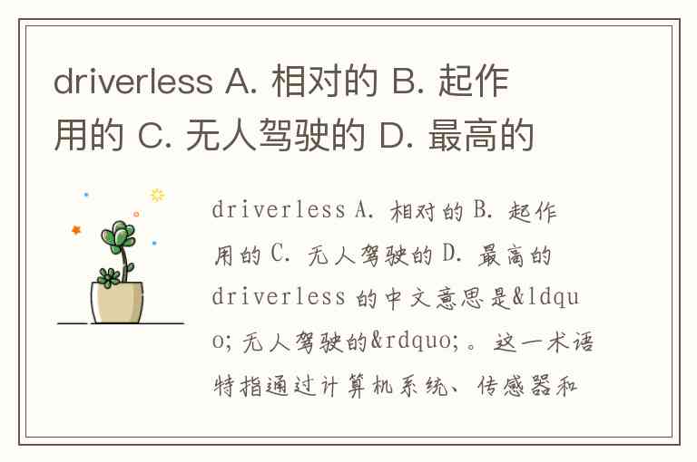 driverless A. 相对的 B. 起作用的 C. 无人驾驶的 D. 最高的