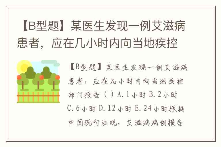 【B型题】某医生发现一例艾滋病患者,应在几小时内向当地疾控部门报告()A.1小时 B.2小时 C.6小时 D.12小时 E.24小时