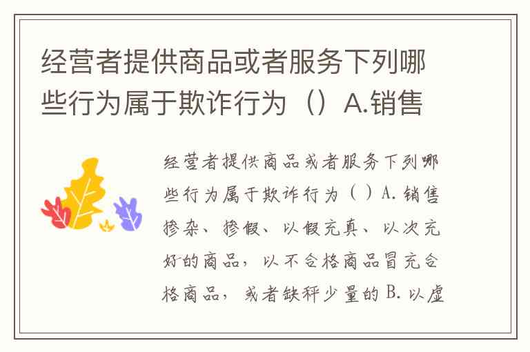 经营者提供商品或者服务下列哪些行为属于欺诈行为()A.销售掺杂、掺假、以假充真、以次充好的商品,以不合格商品冒充合格商品,或者缺秤少量的 B.以虚假的广告、说明、标准、样品、演示等方式销售商品或者提供服务的 C.伪造、冒用商品的产地、认证标志、名优标志、专利标志、检验检疫标志或者他人注册商标、厂名、厂址的 D.法律、法规认定的其他欺诈行为