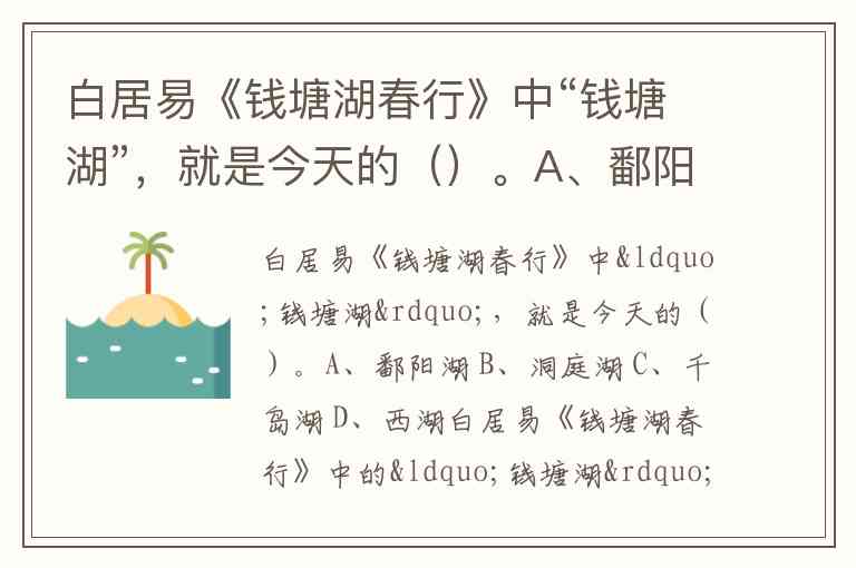 白居易《钱塘湖春行》中“钱塘湖”,就是今天的()。A、鄱阳湖 B、洞庭湖 C、千岛湖 D、西湖