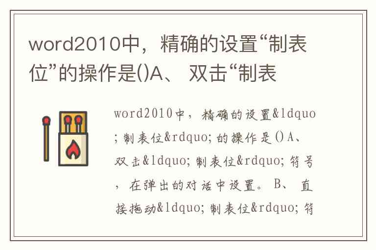 word2010中,精确的设置“制表位”的操作是()A、 双击“制表位”符号,在弹出的对话中设置。 B、 直接拖动“制表位”符号。 C、 单击“开始”功能区中“段落” D、 单击“插入”功能中“符号”