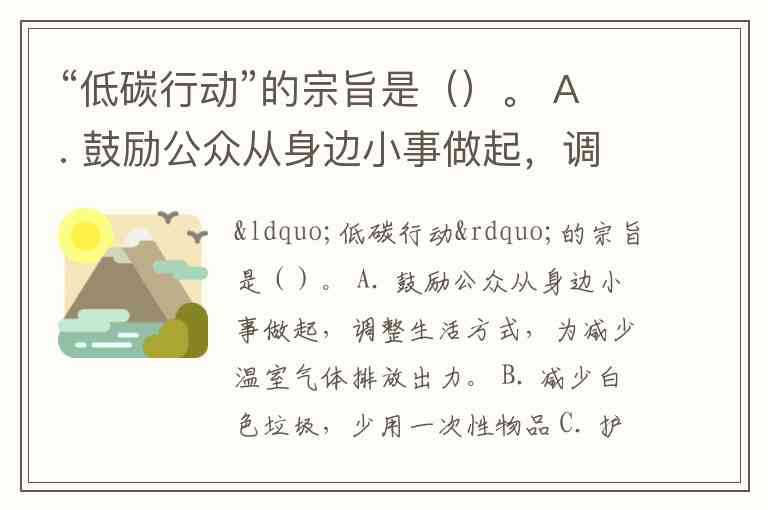 “低碳行动”的宗旨是()。 A. 鼓励公众从身边小事做起,调整生活方式,为减少温室气体排放出力。 B. 减少白色垃圾,少用一次性物品 C. 护林种树,绿化环境 D. 呼吁政府采取措施减低温室气体排放量