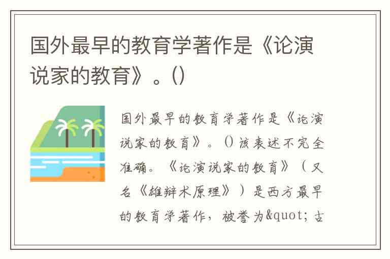 该表述不完全准确。《论演说家的教育》(又名《雄辩术原理》)是西方最早的教育学著作,被誉为"古代西方第一部教学法论著"和"欧洲古代教育理论的最高成就"。但从全球范围看,战国末期的《学记》比其早约300年,是世界上最早专门论述教育问题的专著。二者的定位差异体现了教育史研究中"西方"与"世界"范畴的区分,前者代表古罗马教育理论的巅峰,后者则是先秦儒家教育智慧的结晶。