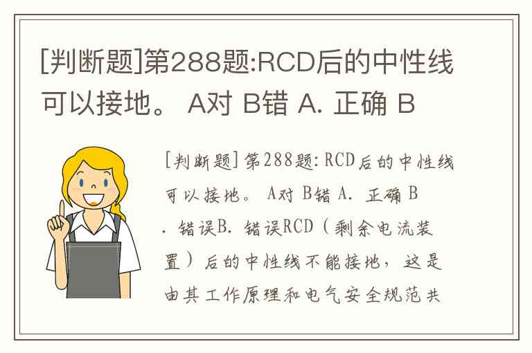 [判断题]第288题:RCD后的中性线可以接地。 A对 B错 A. 正确 B. 错误