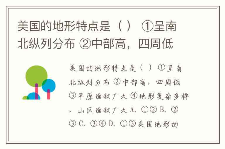 美国的地形特点是( ) ①呈南北纵列分布 ②中部高,四周低 ③平原面积广大 ④地形复杂多样,山区面积广大 A. ①② B. ②③ C. ③④ D. ①③