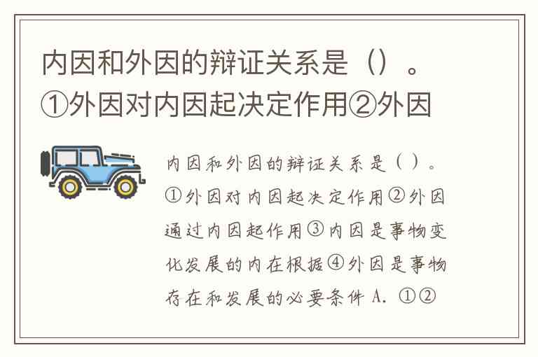 内因和外因的辩证关系是()。①外因对内因起决定作用②外因通过内因起作用③内因是事物变化发展的内在根据④外因是事物存在和发展的必要条件 A. ①②③ B. ①②④ C. ①③④ D. ②③④