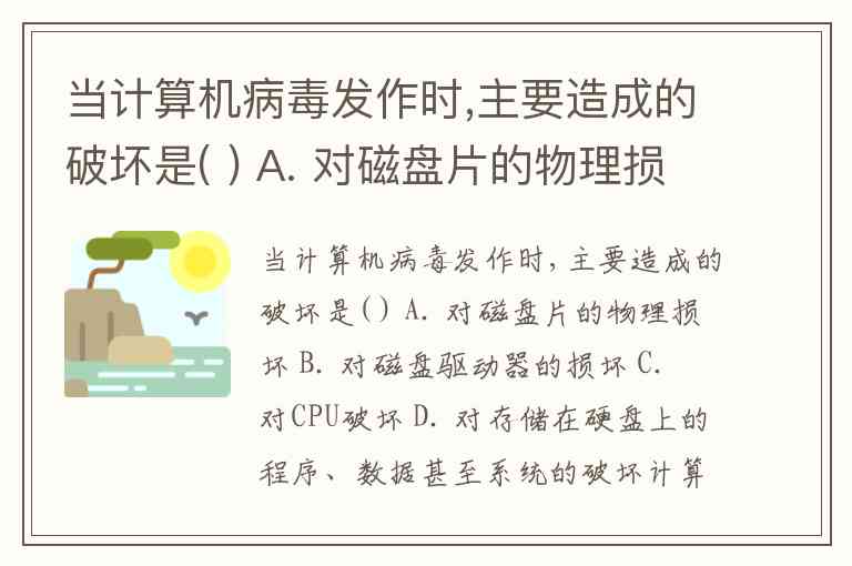 当计算机病毒发作时,主要造成的破坏是( ) A. 对磁盘片的物理损坏 B. 对磁盘驱动器的损坏 C. 对CPU破坏 D. 对存储在硬盘上的程序、数据甚至系统的破坏