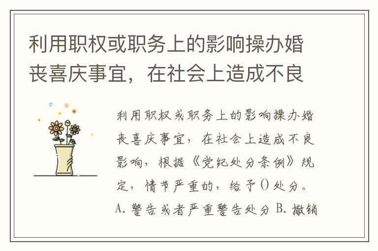 根据《中国共产党纪律处分条例》第一百条规定,利用职权或者职务上的影响操办婚丧喜庆事宜,情节严重的,给予撤销党内职务处分。这一规定明确区分了不同违纪程度的处理方式:造成不良影响的一般情形给予警告或严重警告处分,而当行为达到情节严重标准时,处分升级为撤销党内职务。