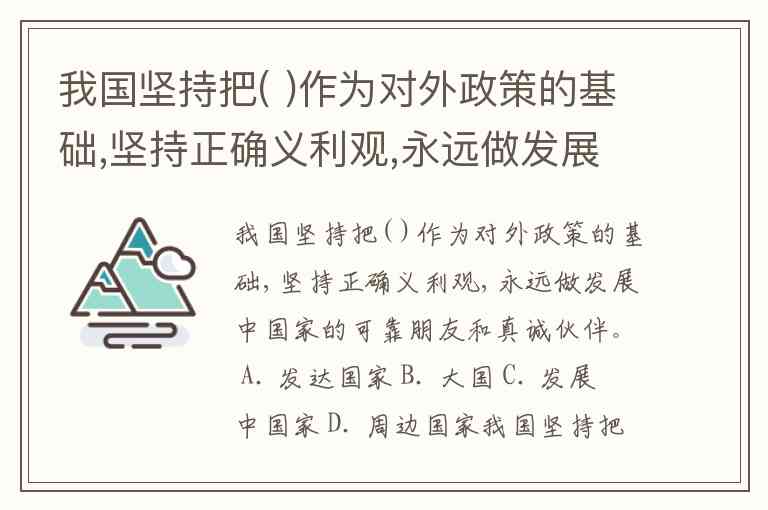 我国坚持把( )作为对外政策的基础,坚持正确义利观,永远做发展中国家的可靠朋友和真诚伙伴。 A. 发达国家 B. 大国 C. 发展中国家 D. 周边国家
