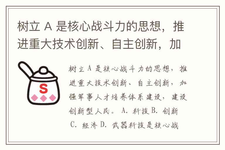 树立 A 是核心战斗力的思想,推进重大技术创新、自主创新,加强军事人才培养体系建设,建设创新型人民。 A. 科技 B. 创新 C. 经济 D. 武器