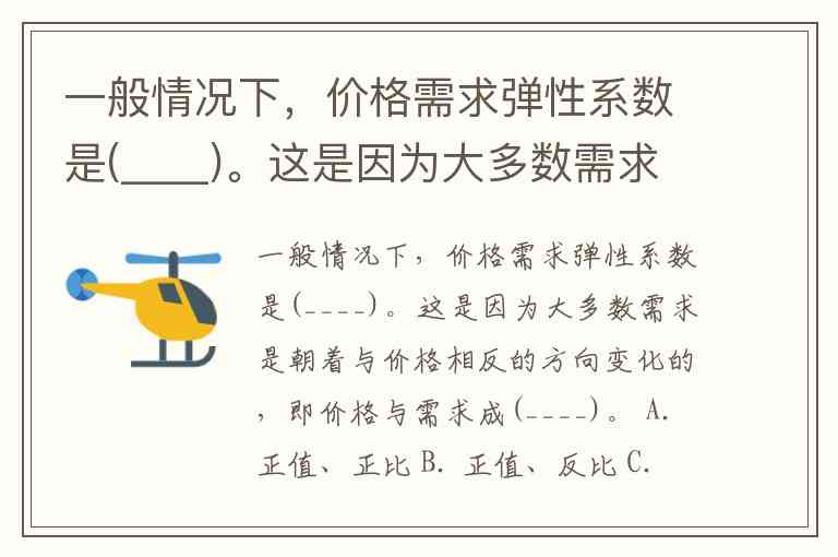 一般情况下,价格需求弹性系数是(____)。这是因为大多数需求是朝着与价格相反的方向变化的,即价格与需求成(____)。 A. 正值、正比 B. 正值、反比 C. 负值、正比 D. 负值、反比