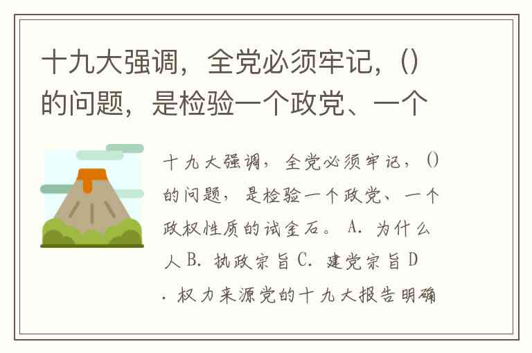 十九大强调,全党必须牢记,()的问题,是检验一个政党、一个政权性质的试金石。 A. 为什么人 B. 执政宗旨 C. 建党宗旨 D. 权力来源
