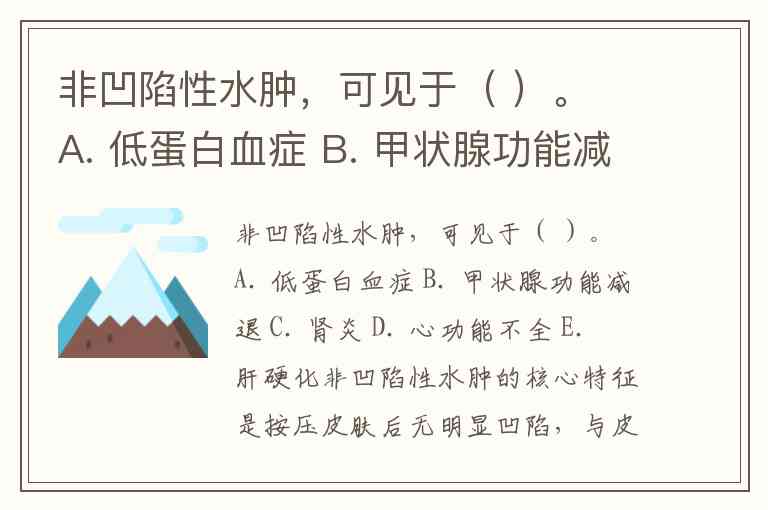 非凹陷性水肿的核心特征是按压皮肤后无明显凹陷,与皮下组织中黏蛋白等胶体物质沉积密切相关。在选项中,甲状腺功能减退(B选项) 是典型病因,因其甲状腺激素缺乏导致黏多糖、透明质酸等物质在皮下积聚,形成特殊的黏液性水肿。这种水肿不同于低蛋白血症(A)、肾炎(C)、心功能不全(D)和肝硬化(E)引起的凹陷性水肿——这些疾病主要因血浆胶体渗透压下降或静脉压力升高,导致血管内液体渗入组织间隙,按压后会留下持久凹陷。
