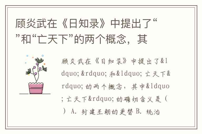 顾炎武在《日知录》中提出了“”和“亡天下”的两个概念,其中“亡天下”的确切含义是() A. 封建王朝的更替 B. 统治阶级内部纷争使得国家分裂 C. 统治者不施行仁政,导致民不聊生 D. 外族入侵带来国家的危难