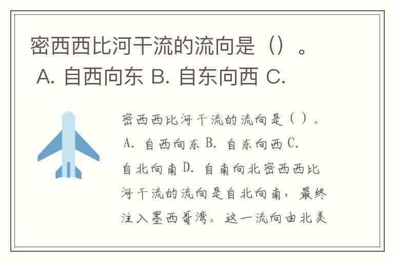 密西西比河干流的流向是()。 A. 自西向东 B. 自东向西 C. 自北向南 D. 自南向北