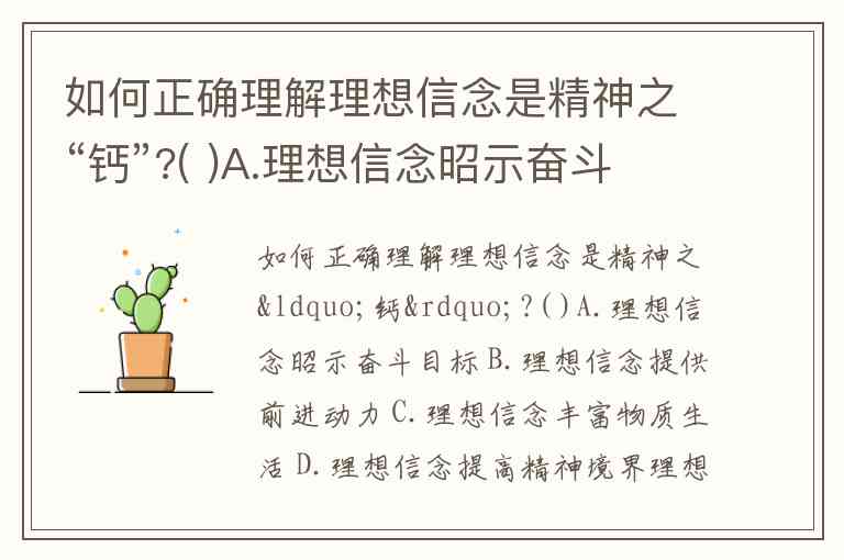 如何正确理解理想信念是精神之“钙”?( )A.理想信念昭示奋斗目标 B.理想信念提供前进动力 C.理想信念丰富物质生活 D.理想信念提高精神境界