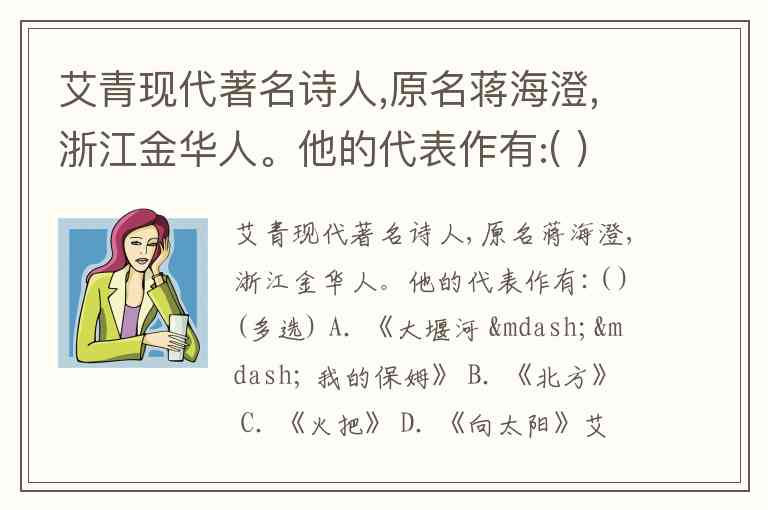 艾青现代著名诗人,原名蒋海澄,浙江金华人。他的代表作有:( )(多选) A. 《大堰河 —— 我的保姆》 B. 《北方》 C. 《火把》 D. 《向太阳》
