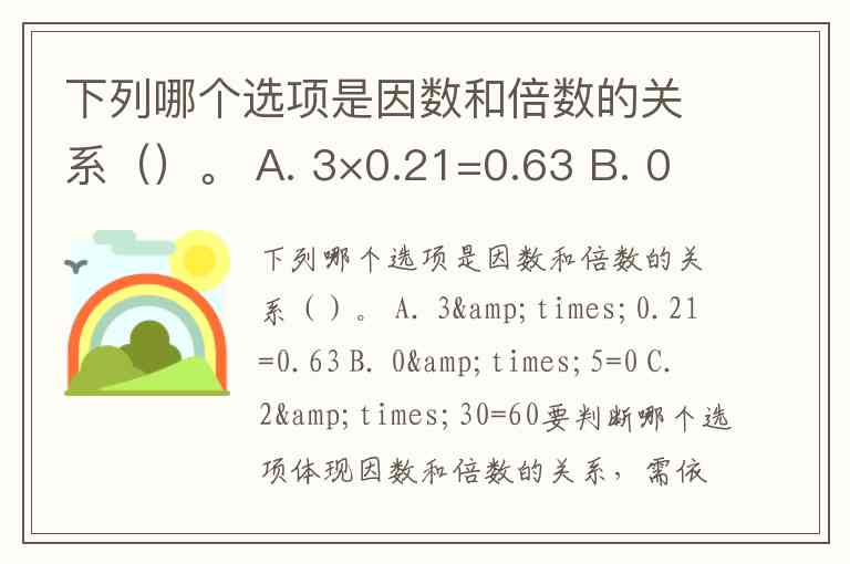 下列哪个选项是因数和倍数的关系()。 A. 3×0.21=0.63 B. 0×5=0 C. 2×30=60