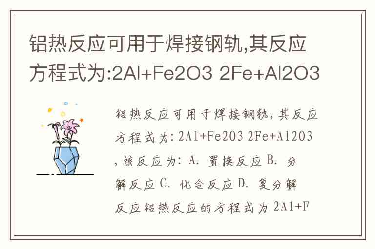 铝热反应可用于焊接钢轨,其反应方程式为:2Al+Fe2O3 2Fe+Al2O3,该反应为: A. 置换反应 B. 分解反应 C. 化合反应 D. 复分解反应