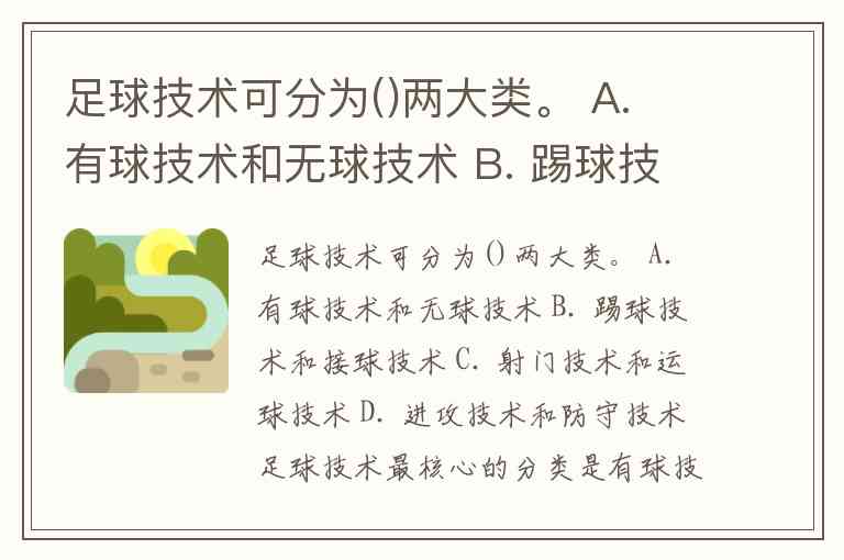 足球技术可分为()两大类。 A. 有球技术和无球技术 B. 踢球技术和接球技术 C. 射门技术和运球技术 D. 进攻技术和防守技术