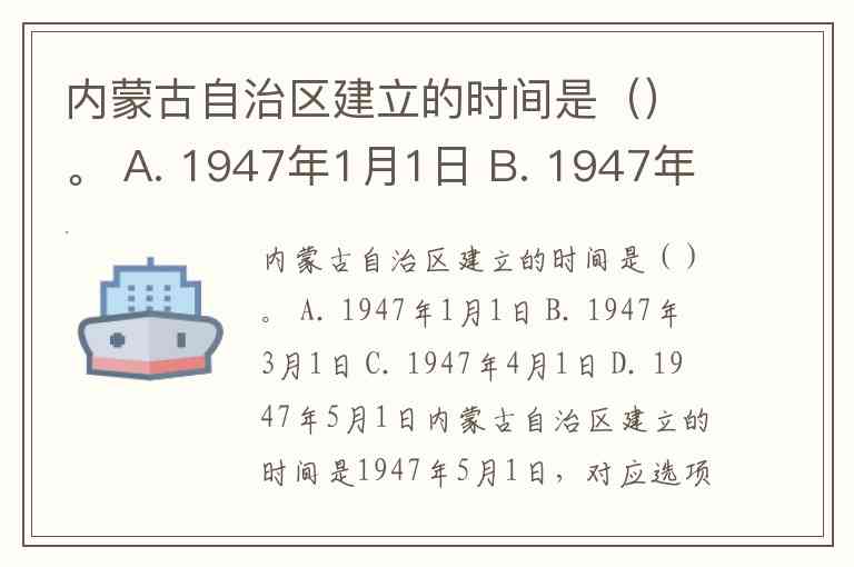 内蒙古自治区建立的时间是()。 A. 1947年1月1日 B. 1947年3月1日 C. 1947年4月1日 D. 1947年5月1日
