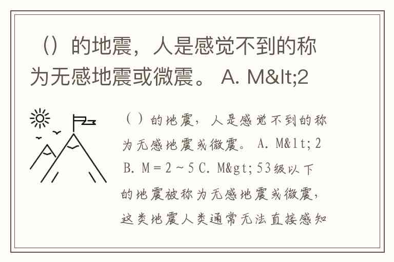 ()的地震,人是感觉不到的称为无感地震或微震。 A. M<2 B. M=2~5 C. M>5