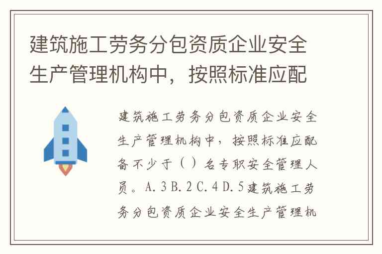建筑施工劳务分包资质企业安全生产管理机构中,按照标准应配备不少于()名专职安全管理人员。A.3 B.2 C.4 D.5