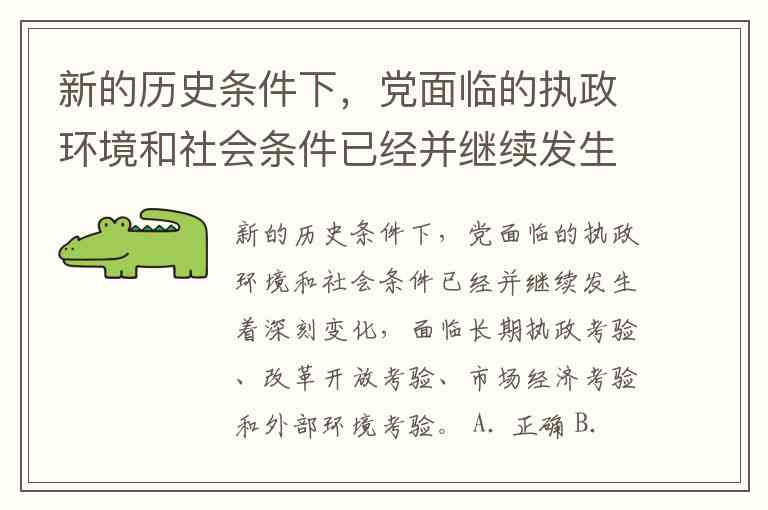 新的历史条件下,党面临的执政环境和社会条件已经并继续发生着深刻变化,面临长期执政考验、改革开放考验、市场经济考验和外部环境考验。 A. 正确 B. 错误
