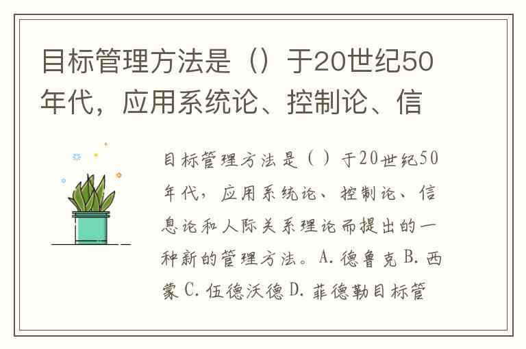目标管理方法是()于20世纪50年代,应用系统论、控制论、信息论和人际关系理论而提出的一种新的管理方法。A.德鲁克 B.西蒙 C.伍德沃德 D.菲德勒