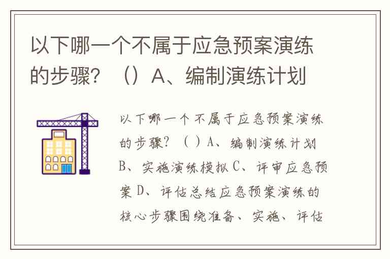 以下哪一个不属于应急预案演练的步骤?()A、编制演练计划 B、实施演练模拟 C、评审应急预案 D、评估总结
