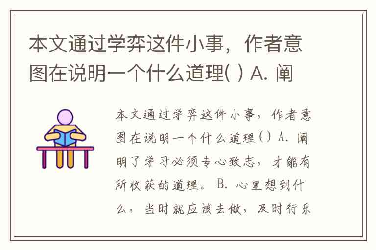 本文通过学弈这件小事,作者意图在说明一个什么道理( ) A. 阐明了学习必须专心致志,才能有所收获的道理。 B. 心里想到什么,当时就应该去做,及时行乐的道理。 C. 不用理会别人怎么做,做好自己就好。