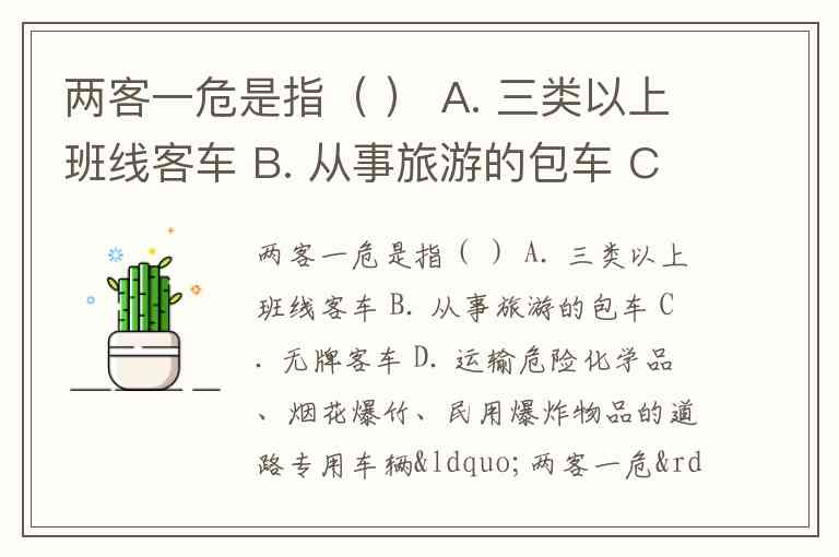 两客一危是指( ) A. 三类以上班线客车 B. 从事旅游的包车 C. 无牌客车 D. 运输危险化学品、烟花爆竹、民用爆炸物品的道路专用车辆