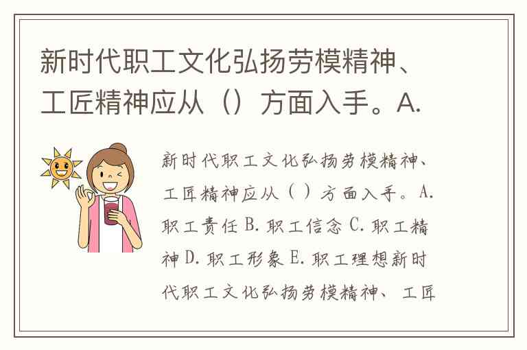 新时代职工文化弘扬劳模精神、工匠精神应从()方面入手。A.职工责任 B.职工信念 C.职工精神 D.职工形象 E.职工理想