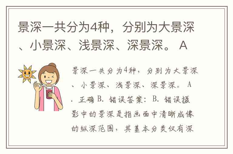 部分资料提到“全景深”等术语,但这是深景深的极端情况(如微距摄影中前后都清晰),并非独立类型;而“推拉焦点”“柔焦”等属于景深的应用技巧,而非分类。学术文献和权威摄影教程均以“深浅”或“大小”作为核心划分标准,从未出现“四种景深”的正式分类。