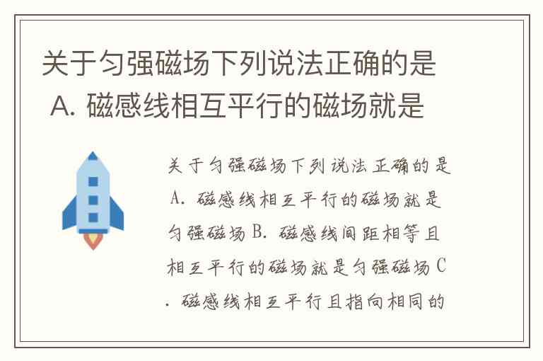 A、C错误:仅“平行”或“平行且指向相同”无法保证磁场强弱均匀。例如,间距不等的平行磁感线对应强弱变化的磁场。