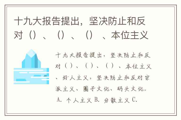 十九大报告提出,坚决防止和反对()、()、() 、本位主义、好人主义,坚决防止和反对宗派主义、圈子文化、码头文化。 A. 个人主义 B. 分散主义 C. 自由主义 D. 形式主义