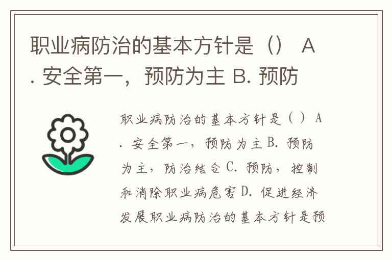 职业病防治的基本方针是() A. 安全第一,预防为主 B. 预防为主,防治结合 C. 预防,控制和消除职业病危害 D. 促进经济发展