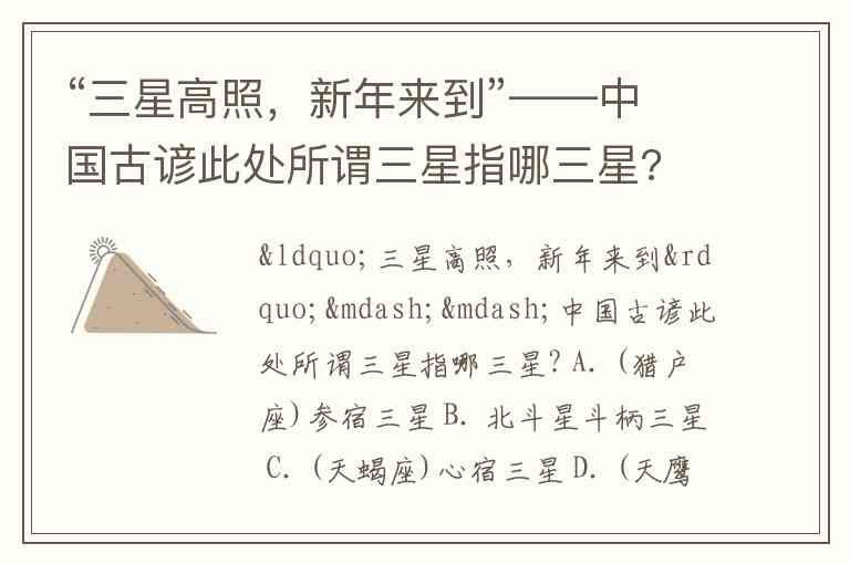 “三星高照,新年来到”——中国古谚此处所谓三星指哪三星? A. (猎户座)参宿三星 B. 北斗星斗柄三星 C. (天蝎座)心宿三星 D. (天鹰座)河鼓三星