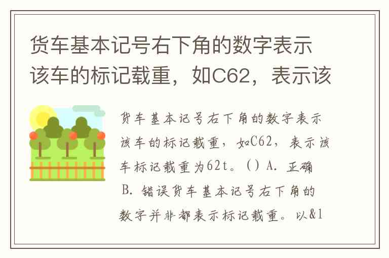 货车基本记号右下角的数字表示该车的标记载重,如C62,表示该车标记载重为62t。( ) A. 正确 B. 错误