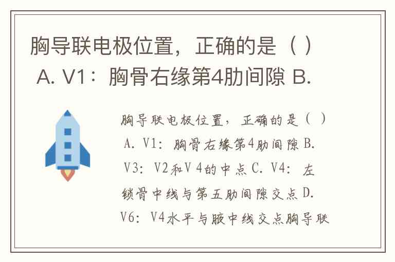 胸导联电极位置,正确的是( ) A. V1:胸骨右缘第4肋间隙 B. V3:V2和V 4的中点 C. V4:左锁骨中线与第五肋间隙交点 D. V6:V4水平与腋中线交点